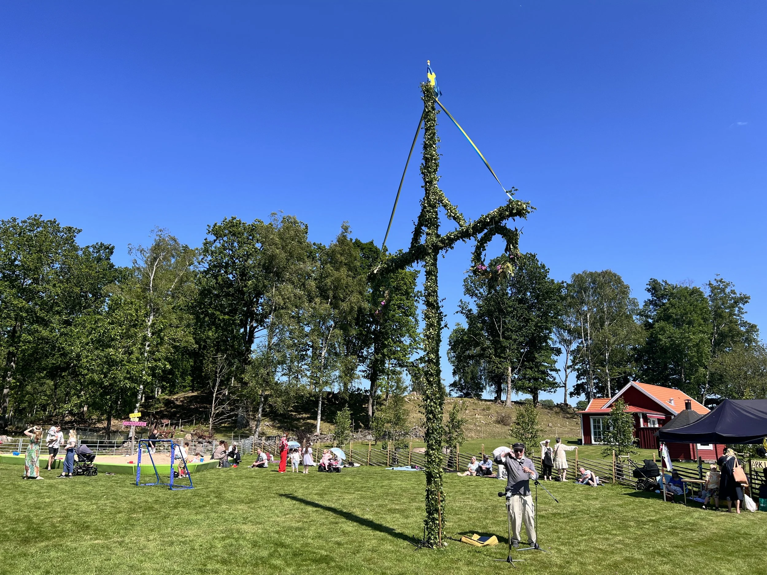 Auch wir pflücken Blumen und fahren zum nahe gelegenen Gunnargard, ein Bauernhof in der Nähe von Ullared. Dort ist viel los. Alle haben sich schick gemacht, die Frauen tragen Sommerkleider, die Männer Hemden. Kinder flitzen herum, Buden sind aufgebaut, die Midsommarstång steht bereits. Das ist eine Tradition aus dem Mittelalter. Die Schweden stellen einen Baum auf, umwickelt mit Zweigen und Blumen auch Majstång genannt. Das ist kein Maibaum, sondern “Maj” kommt vom Verb maja und heißt mit Blumen schmücken.